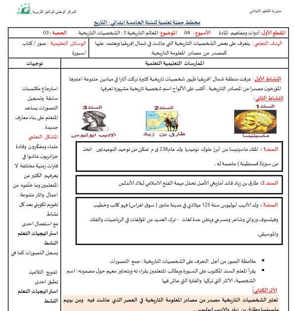 المذكرات الوزارية للسنة الخامسة ابتدائي في مادة التاريخ المقطع الاول درس المعالم التاريخية الشخصيات التاريخية