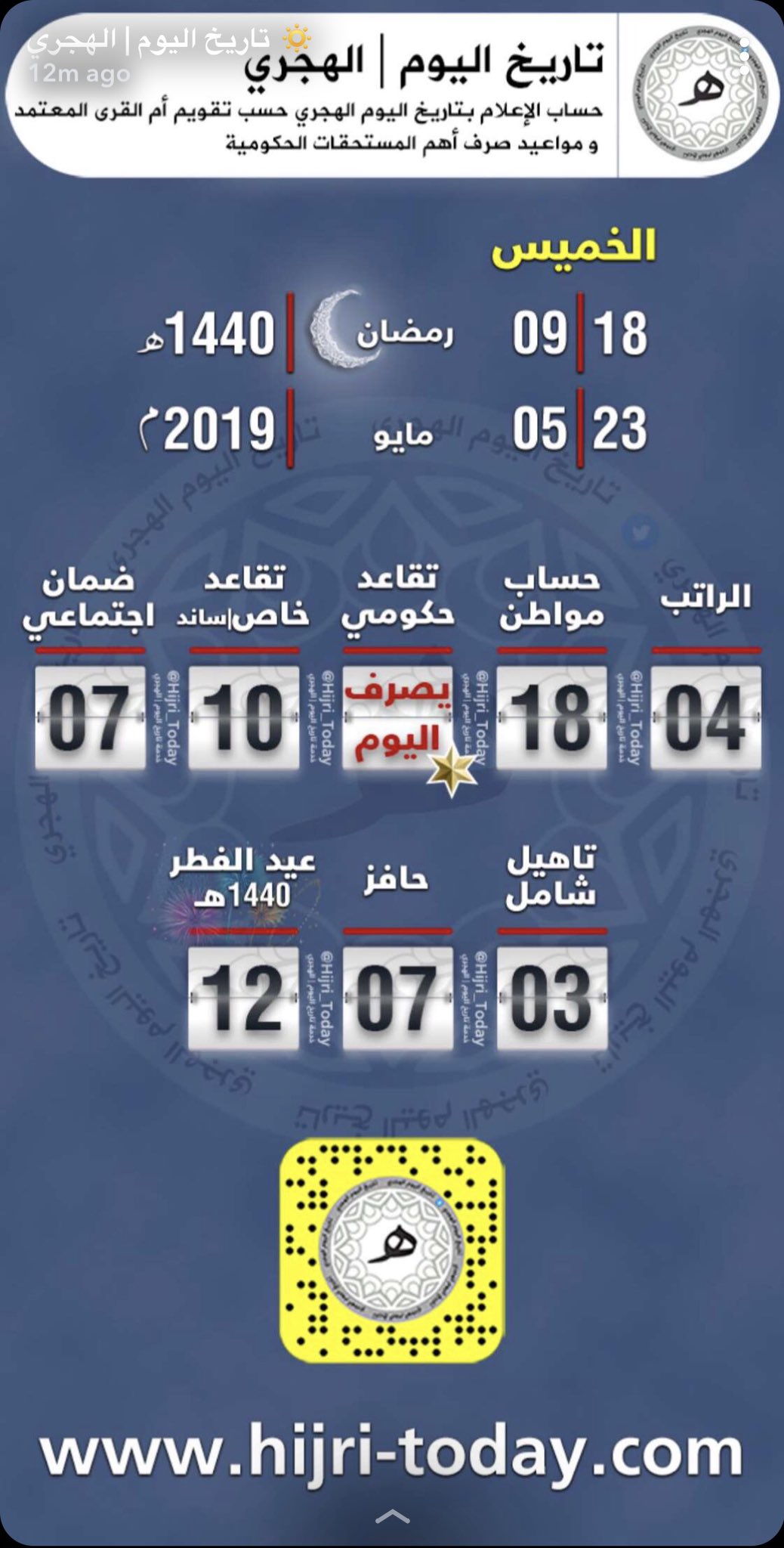 تاريخ اليوم الهجري On Twitter الاربعاء ٢٧ رجب ٠٧ ١٤٤٠هـ الموافق ٠٣ ابريل ٠٤ ٢٠١٩م ايام متبقية الراتب 25 ح المواطن 07 تقاعد حكومي 22 تقاعد خاص ساند 28 الضمان 04 التأهيل 22 حافز 07 رمضان 33 نهاية الدراسة 29 استغفر الله محمد ﷺ