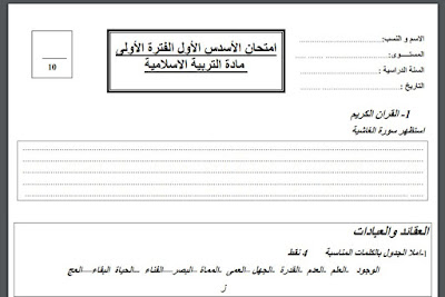 امتحان الأسدس في مادة التربية الاسلامية الأول الفترة الأولى المستوى السادس إبتدائي