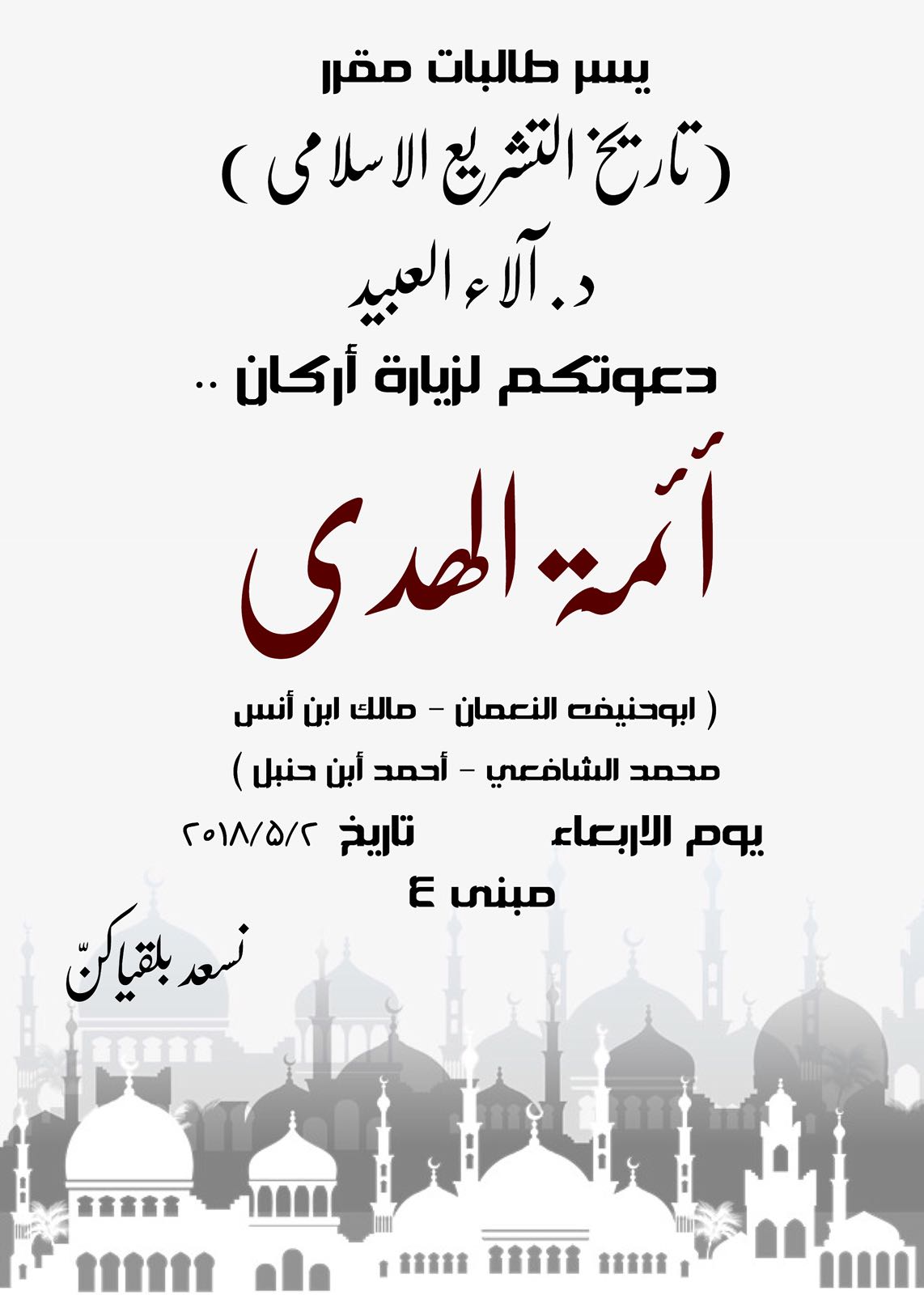 د آلاء العبيد Auf Twitter بالتعاون مع جمعية الشريعة يسر طالبات مقرر تاريخ التشريع الإسلامي دعوتكم لزيارة معرض أئمة الهدى حضوركم تشريف Https T Co Osattvaxhp