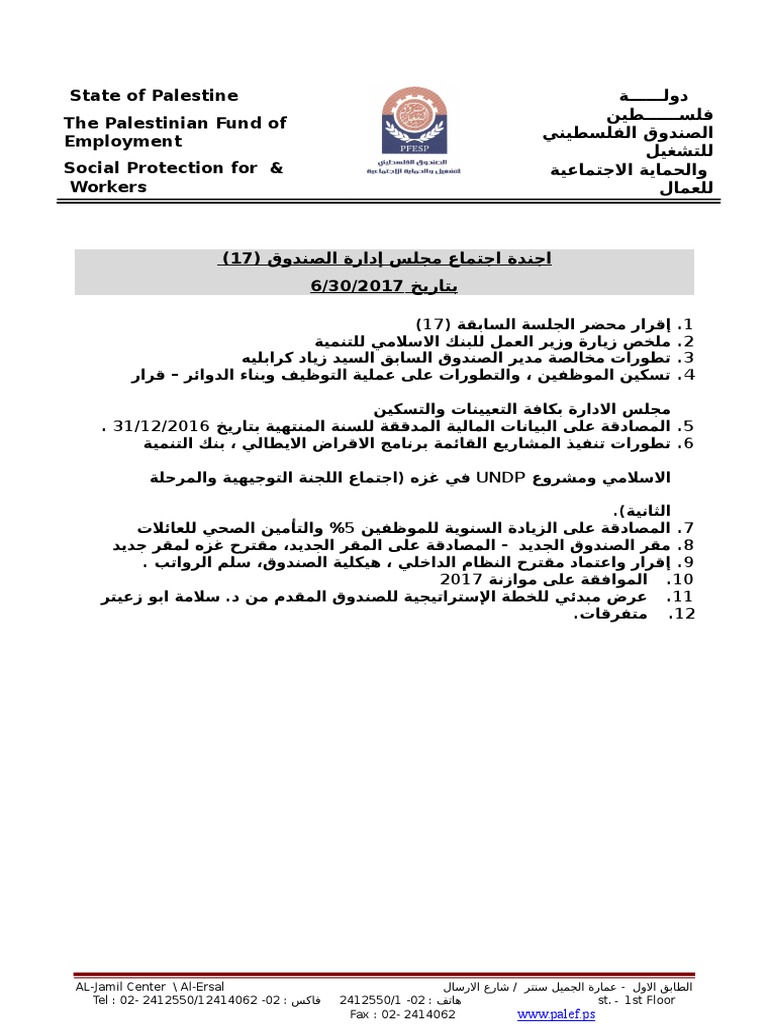 ةــــــلود نيطــــــسلف قودنصلا ينيطسلفلا ليغشتلل ةيامحلاو ةيعامتجتلا لامعلل State Of Palestine The Palestinian Fund Of Employment Social Protection For Workers