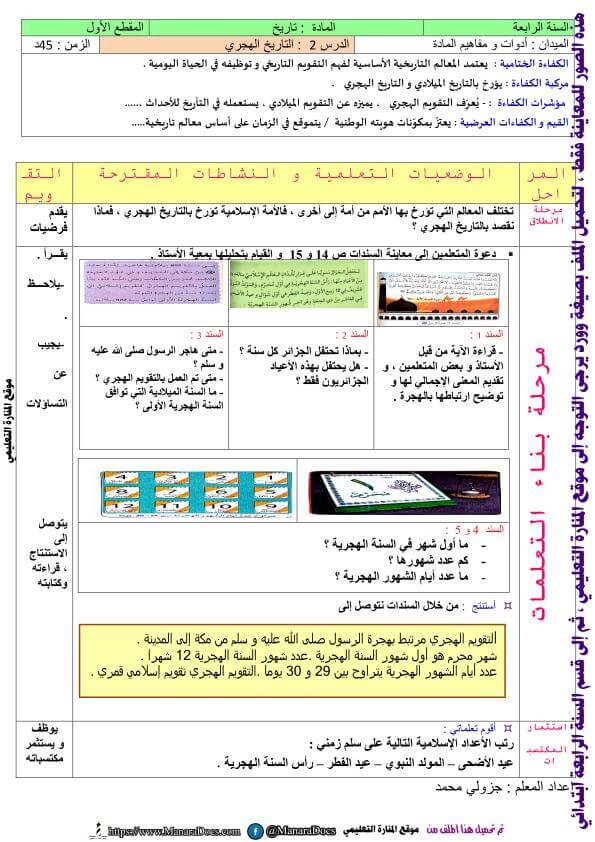 مذكرات السنة الرابعة 4 ابتدائي في التاريخ المقطع الاول درس التاريخ الهجري وورد Word