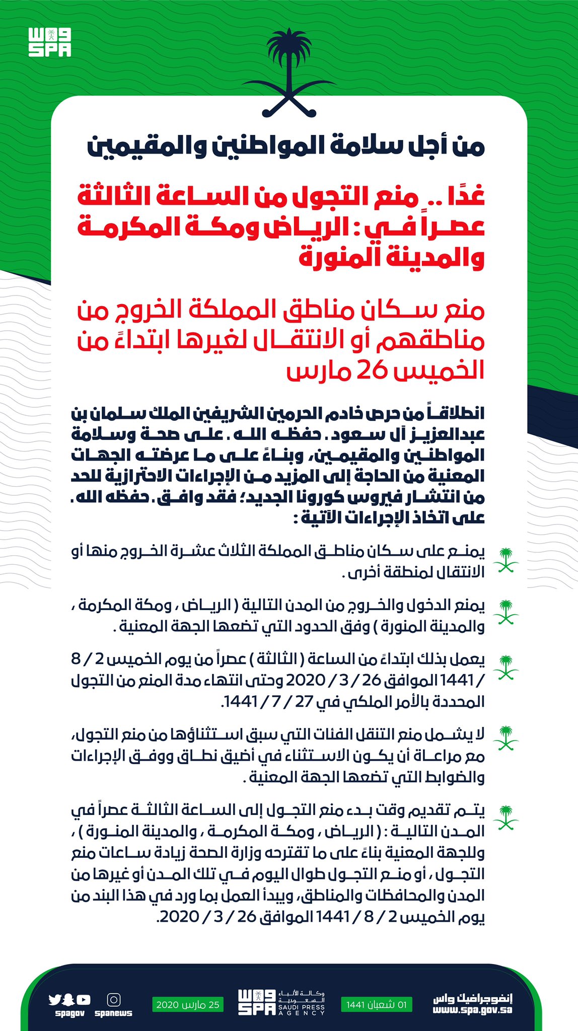 واس الأخبار الملكية On Twitter انفوجرافيك واس ابتداء من الخميس 26 مارس منع سكان مناطق المملكة الخروج من مناطقهم أو الانتقال لغيرها ومنع التجول من الساعة الثالثة عصرا في الرياض ومكة
