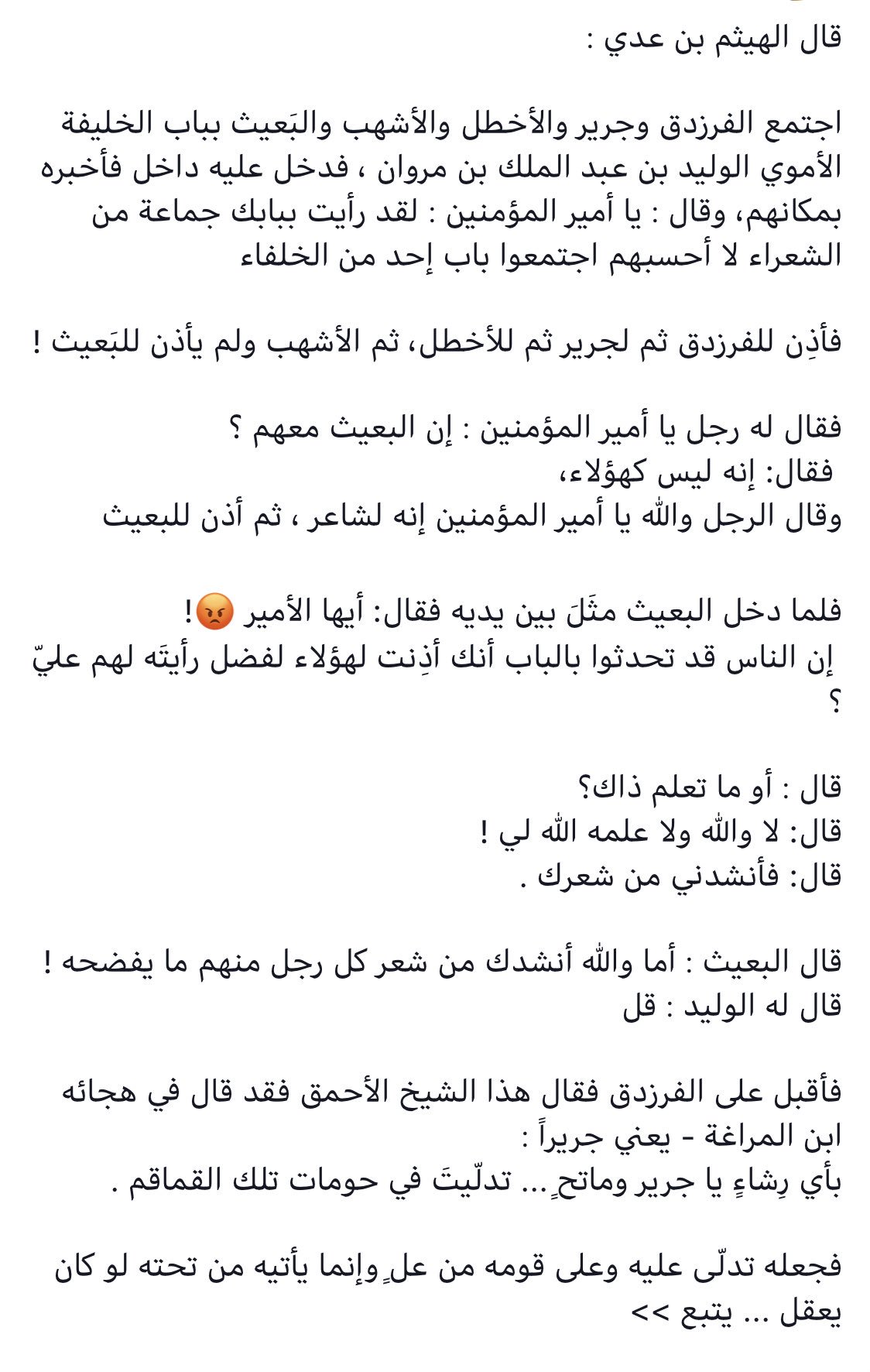 مناور سليمان บนทว ตเตอร قال الهيثم بن عدي اجتمع الفرزدق و جرير و الأخطل و الأشهب والب عيث بباب الخليفة الأموي الوليد بن عبد الملك بن مروان فدخل عليه داخل فأخبره